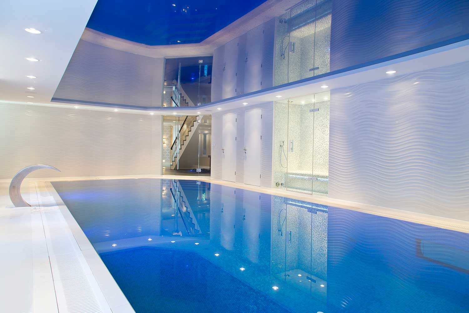 A beautiful contemporary and luxurious residential pool room maximizing the scale of the pool at 15m long and 4m wide with a deep end as the clients are diving enthusiasts.